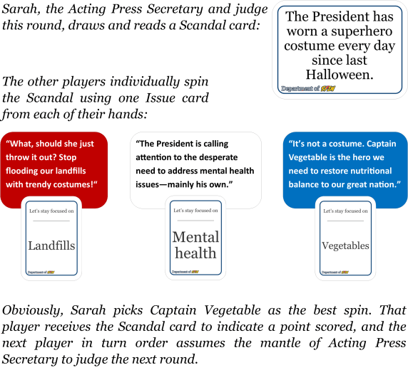 Proceeding in turn order to the judge’s left, each player selects an Issue card from his or her hand and uses it to craft a brief spin explaining why the Scandal is in fact a good thing. Here’s an example: